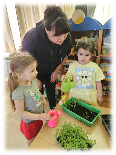 Поздней весной, на участке детского сада, ребята, под руководством педагогов, ответственных за направление работы, высаживают рассаду в парники, клумбы, вазоны и ухаживают за ней.